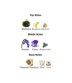 رایحه میانی: آکورد بنفشه وحشی، برگ انگور فرنگی سیاه، گل استکانی آبی