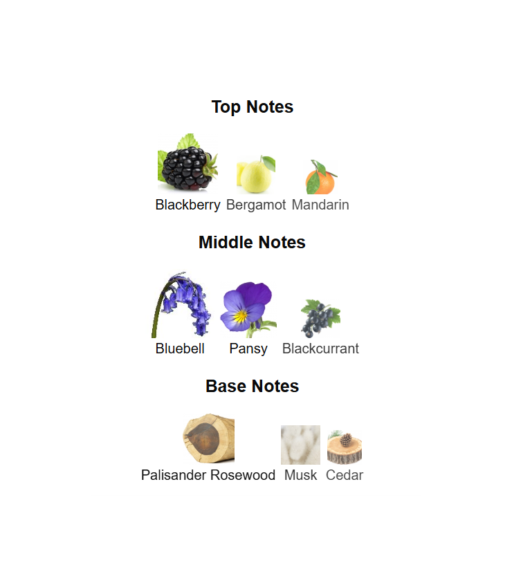 رایحه میانی: آکورد بنفشه وحشی، برگ انگور فرنگی سیاه، گل استکانی آبی